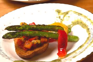 Servering: I god tid før retten skal på bordet, legger du paprikablandingen opp på toasten. Det er viktig at dette får stå og trekke litt slik at toasen blir medgjørlig når den skal spises. Legg toasten på en tallerken som er streket opp med salsa verde. Skjær de resterende paprikafiletene i tynne, avlange strimler. Rett før servering legger du på asparges og fletter et par paprikastrimler rundt stilkene. Stiligere blir det ikke.