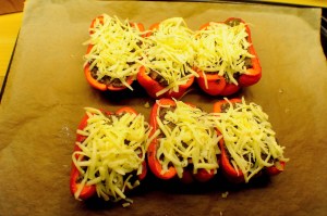Slik gjør du det: Del paprikaene på langs, skrap ut frø og fjern stilk (Du kan selvfølgelig beholde stilken som pynt, hvis du insisterer). Legg paprikaene på bakepapir på stekebrett og kjør dem på 200 grader i ovnen i fem minutter. Ta ut, tøm dem for vann, stapp inn fyllet og deretter setter du paprikaene tilbake på bakepapiret. Strø ost over. Saken er nå at paprikaene trenger minimalt med tid i ovnen siden du har vært så genial å for-steike. Du kan nesten vente med å sette dem i ovnen til gjestene sitter ved bordet. Når tiden er inne, lar du paprikaene først få fem minutter på 200 grader, deretter skrur du på grillelementet og lar dem få ytterligere ett minutt så osten blir lekkerbrun.