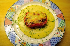 Det smakte ganske kjedelig. Hvis jeg skal være helt ærlig, syntes jeg det var et gjennomgående trekk i hele ferien. I Hellas er ikke vegetarisk mat det de er best på. Grekerne er gode på mye annet. I en periode hvor mye er vondt og vanskelig i den greske økonomien, er det kanskje best å minne om positive ting. Sol, strender, kultur, antikken, filosofi. Likevel. Fylt paprika får du nesten over alt i Hellas, ofte som det eneste vegetariske alternativet på menyen (ja, ja, jeg vet at det finnes unntak fra regelen). Og fylt paprika er ganske triste greier. Faktisk er denne retten en klassiker i vegetarmat. Ofte like kjedelig der også. Man steker en eller annen avart av soya, lager en tomatsaus, koker ris og blander det hele. Detter fyller man paprikaene. Vel, vel. Her er et lite tips som gjør denne retten strået hvassere.