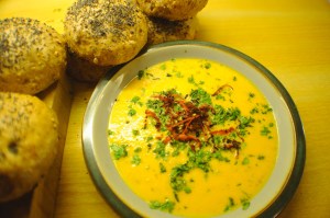 Noen ganger må man grave litt dypere for å finne godsakene. I mange år var jeg blind for den fantastiske smaken som skjuler seg rett under jordas overflate. Takket være en godt utviklet skepsis i barndommen, tok det lang tid før jeg endelig fikk øynene opp for rotgrønnsaker. Det er lite annet som gir like mye smak for pengene. Vi snakker om gulrøtter, sellerirot, pepperrot, kålrot, potet, jordskokk osv. Nei, det trenger ikke være kjedelig selv om vi snakker om urtradisjonelle greier. Ovnsbakte rotgrønnsaker er en klar vinner. For ikke å snakke om rotgrønnsaksmos. Men nå som kveldene er lysere, badesesongen nærmer seg og vi kanskje tenker litt ekstra på sunnhet og kalorier, slår jeg et slag for rotgrønnsakssuppa. For mitt eget vedkommende handler det om å kombinere to gamle skepsiser.  Suppe har i mine øyne aldri vært skikkelig mat. Så feil kan man ta. Denne suppa står godt på egne bein. Her gir rotgrønnsakene den gode basissmaken i bånn, og så kan du fylle på med det du måtte ha av  rester i grønnsaksskuffen i tillegg. Med et par små triks, litt frisk koriander og en anelse garnityr på toppen, får du et herremåltid. Det gjør selvfølgelig ingenting om du kan by på nybakte rundstykker i tillegg (Hatting gjør jobben på 8 minutter hvis du har det travelt).