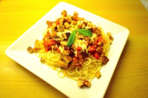 Du trenger: Helst fersk pasta i en eller annen variant. 1 gul og 1 rød løk, to små paprikaer, gjerne i ulik farge, 6 klasetomater, 2 bokser hakket tomat, 4 fedd hvitløk, 200 gram fersk sjampinjong, to stenger stangselleri, 1 laurbærblad,1 ss timian, 1 knivsodd chilipulver, litt ketchup, 2 ss tomatpuré, salt og sukker, revet mozzarella, olje til steking. Dessuten ½ boks nuttolene, som fortsatt er i salg på en del helsekostbutikker. Finner du det ikke, er det muligens like greit. Da rister du i stedet usaltede peanøtter på tørr panne og bruker som garnityr.
