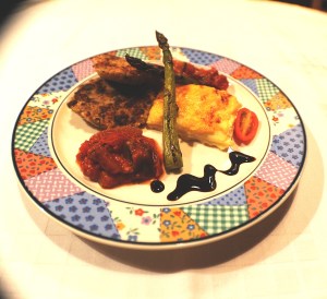 200 gram arborioris, 1 liter grønnsaksbuljong, en skvett vermut eller halvtørr hvitvin, 100 gram revet parmesan, 1 rød løk, 1 grønn squash, 6 store sjampinjonger ( her er smaken som baken, du kan gjerne bytte ut disse grønnsakene med andre, for eks gulrøtter), 1 liten purre, 3 fedd hvitløk, olje, salt, pepper, og semulegryn til utbaking og steking.