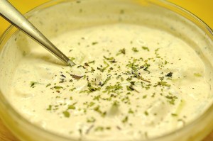 Ingen indisk middag uten raita. Jeg mener det, dennne yoghurtdressingen løfter måltidet og mildner, runder av og demper heftige sauser, koftaer og masalaer. Raita kan lages i mange varianter. Stort sett handler variasjonen om ulike typer finhakkede, rå grønnsaker som blandes i yoghurten. Vil du ha tjukk raita, bruker du matyoghurt, eller vanlig naturell dersom du vil ha den litt mere flytende. Jeg foretrekker den siste, enkle varianten, kun med finstrimlet agurk som følgesvenn. Men ikke glem mynten, den er obligatorisk.