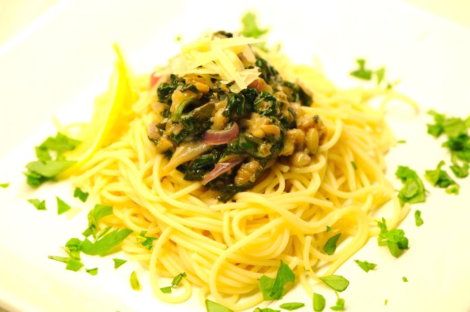 Du trenger: Pasta til 4 personer, 400 gram fersk spinat, vasket og renset, 1 liten rødløk skåret i tynne halvmåner, 6-8 fedd knust hvitløk, 1 liten rød chili finhakket, en håndfull godt hakkede valnøtter, noen pinjekjerner, saften fra 1 sitron, en god dæsj extra virgin olivenolje, en skvett fløte, salt, sukker, nykvernet pepper og en håndfull finhakket bladpersille, samt noen flak med fersk parmesan. Til garnityr kan du bruke sprøstekt kantarell eller annen valgfri sopp.