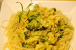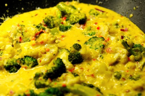 Du trenger:  1 liten blomkål, 1 liten brokkoli, 1 liten rødløk, en stor, rød chili, 4 fedd hvitløk,  1,5 dl matfløte, 2 ss crcme fraiche, parmesan, salt, pepper, saften fra 1 lime,  olivenolje, masala-krydder, safran/gurkemeie og litt koriander.