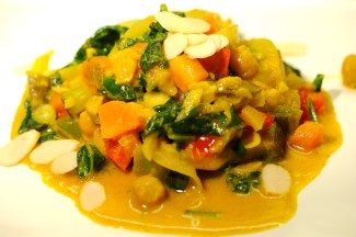 Slik gjør du det: Rens grønnsakene og kutt dem i terninger, grovhakk spinaten, skyll kikertene, løken deles i halvmåner. Ta halvparten av olja i ei stor gryte og surr grønnsakene, de hardeste først, sammen med kikertene. Vent med squashen og spinaten. I ei lita gryte varmer du opp resten av olja sammen med finhakka hvitløk og krydderene. La det surre litt og hell blandinga over grønnsakene. Tøm over juicen og rør det hele sammen. La det småputre til grønnsakene begynner å bli møre, da først hiver du inn squashen som ikke skal ha så lang tid før den er passe mør. Fem minutter før servering rører du inn spinaten og mandler og lar det hele koke et par minutter. Det underlige er at dette ikke blir tynt og suppete, men at juicen og krydderne går sammen i en deilig saus. Smak avslutningsvis til med salt og litt sukker.