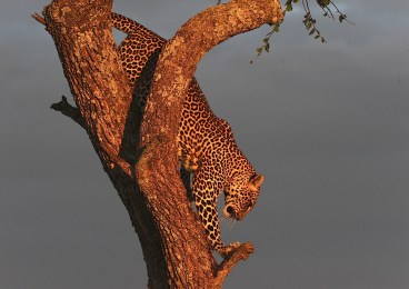 Litt senere stod vi under treet der sjakalene bjeffet for harde livet. Og så åpenbarte den seg i all sin prakt. Leoparden vår var vidunderlig vakker, smekker, muskuløs og livsfarlig. Denne natta hadde den tilbrakt i treet sammen med byttet sitt. Nå var den mett og på vei inn i bushen for å sove på full mage. Sjakalene ville ha restene av måltidet. Det kunne de bare glemme.