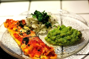 Finn fram ei lavkantet, ildfast form som du sprinkler med litt olje i bunnen. Ta en auberginerskive, smør den med en tynt lag tapenade, legg på et stykke grillet paprika og en skive mozzarella. Rull fast og fint. Sett deretter på høykant i forma. Etter hvert som du produserer flere, setter du dem tett i tett. Til slutt putter du hele herligheten i kjøleskapet slik at rullene får satt seg. Nå kan du velge. Sushi? Forrett? Ta dem med på piknik? Eller kanskje du skal lune rullene i ovnen på 125 grader i ti minutter og servere dem inntil en tomatsaus med en touch av chili, pluss safranris. Hmm. Mulighetene er mange. Uansett, dette sklir ned.