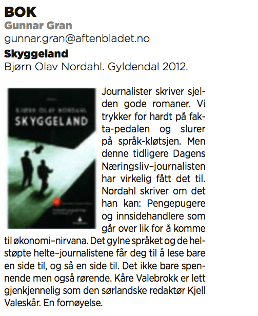 «Finanansthrilleren «Skyggeland» til gravejournalisten Bjørn Olav Nordahl anbefales. Den var et hyggelig feriefølge.» Politimesteren i Hordaland, Geir Gudmundsen, på Twitter 15. juli